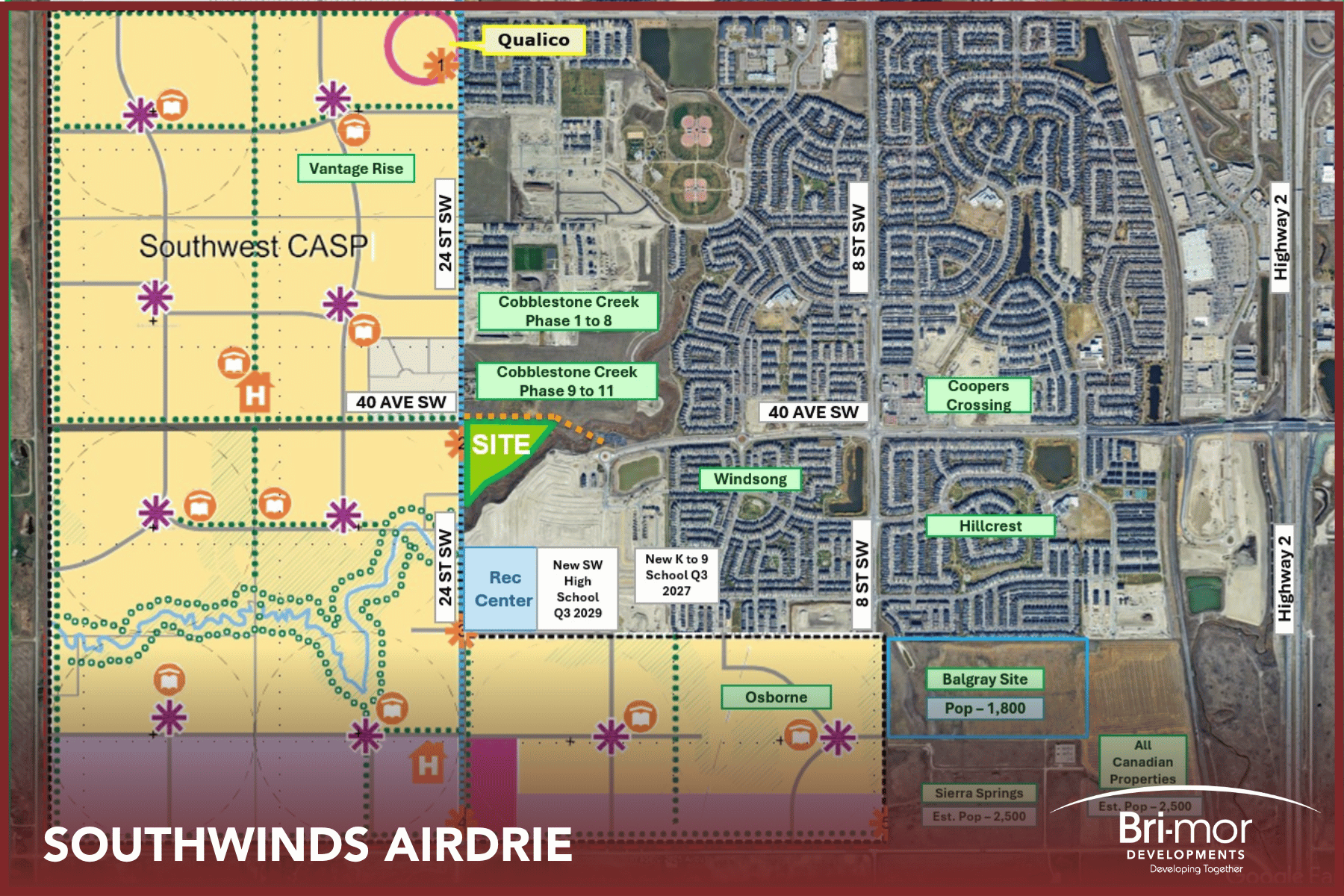 The site is near to the new 1,800 student high school, the SW recreation centre that will draw an estimated 1 million annual visits, and new residential development with an average annual household income of $177,000 by 2030.